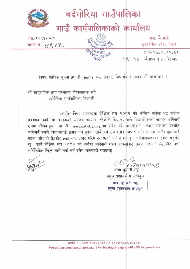 » बर्दगोरिया गाउँपालिकाका सामुदायित तथा संस्थागत विद्यालयहरु सबै । शैक्षिक सूचना प्रणाली iemis बाट ग्रेडसिट विद्यार्थीलाई प्रदान गर्ने सम्बन्धमा
