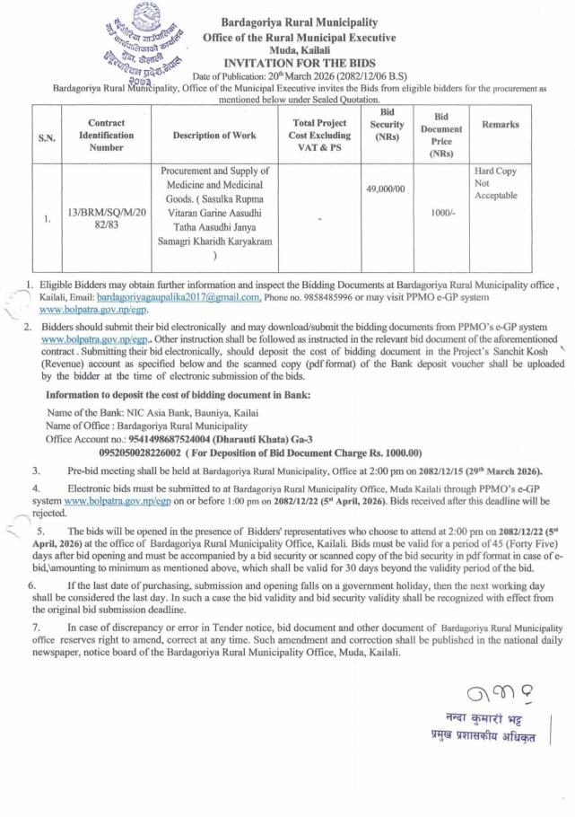 औषधि तथा औषधिजन्य सामाग्री खरिदको बोलपत्र आह्वान सम्बन्धी सूचना।