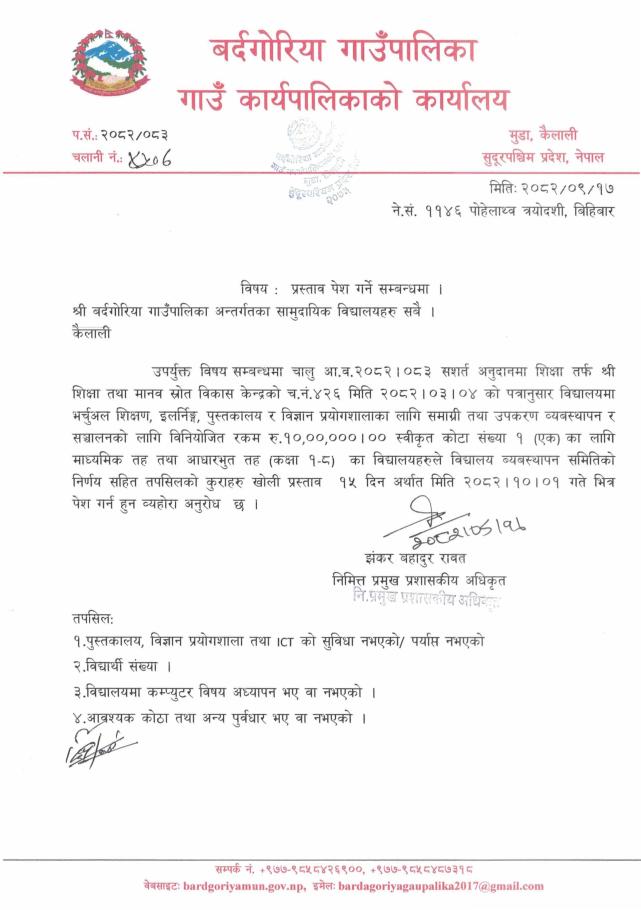 » प्रस्ताव पेश गर्ने सम्बन्धमा। बर्दगोरिया गाउँपालिका अन्तर्गतका सामुदायीक विद्यालयहरु सबै।