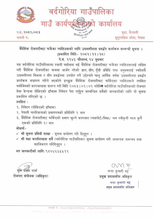 बैदेशिक रोजगारीबाट फर्केका व्यक्तिहरुको लागि उद्दमशिलता प्रदवर्द्धन कार्यक्रम सम्बन्धी सूचना ।