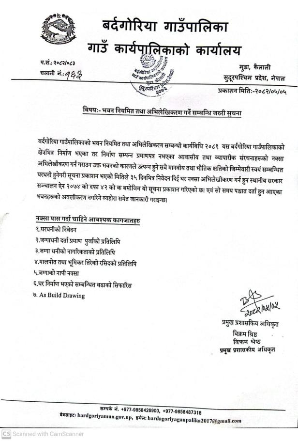 भवन नियमित तथा अभिलेखिकरण गर्ने सम्बन्धी जरुरी सूचना।