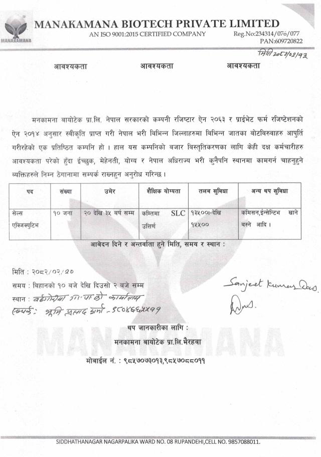 » मनकामना बायोटेक प्रा.लि.द्वारा कर्मचारी आवश्यकता सम्बन्धी सूचना ।