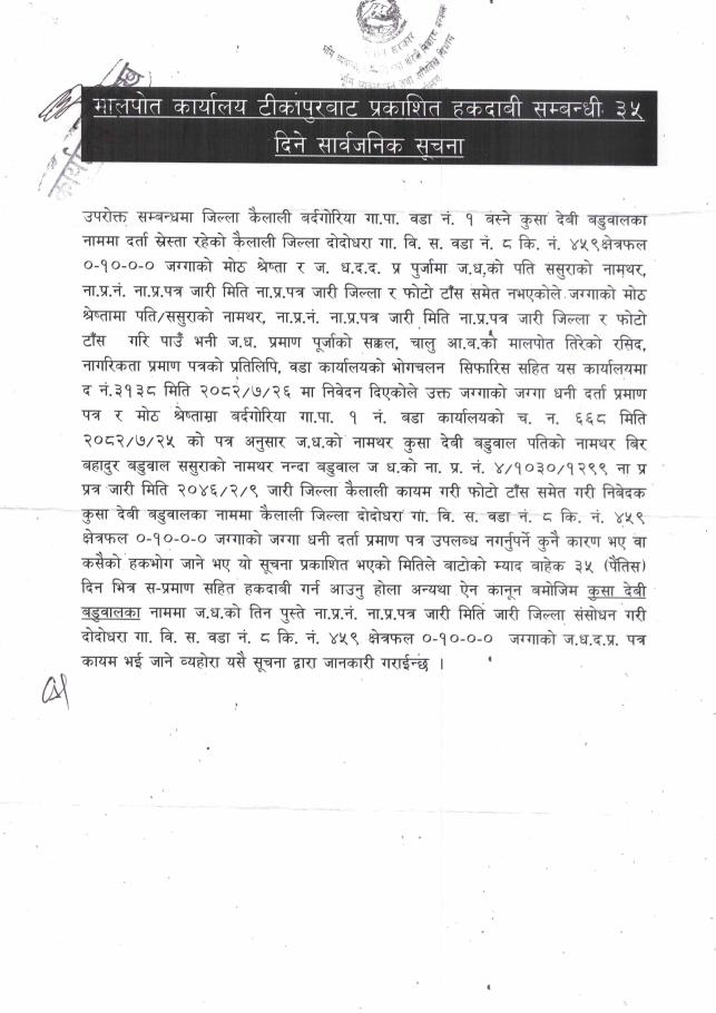 मालपोत कार्यालय टीकापुरबाट प्रकाशित हकदाबी सम्बन्धी ३५ दिने सार्वजनिक सूचना ।