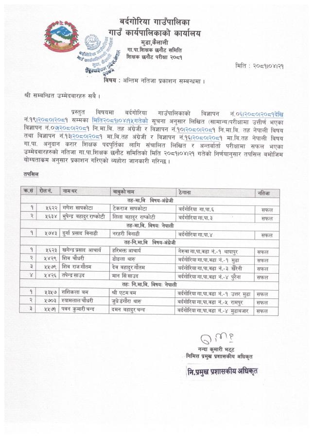 मा.वि र नि.मा.वि तहको शिक्षक पदको अन्तिम नतिजा प्रकाशन सम्बन्धी सूचना।