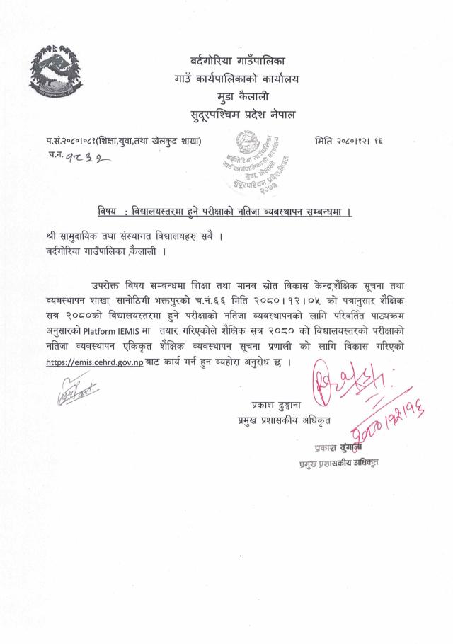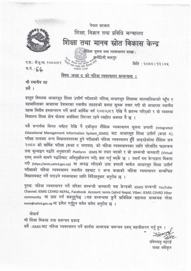 विद्यालयस्मातरमा हुने परीक्षाको नतिजा व्यवस्थापन सम्बन्धमा ।