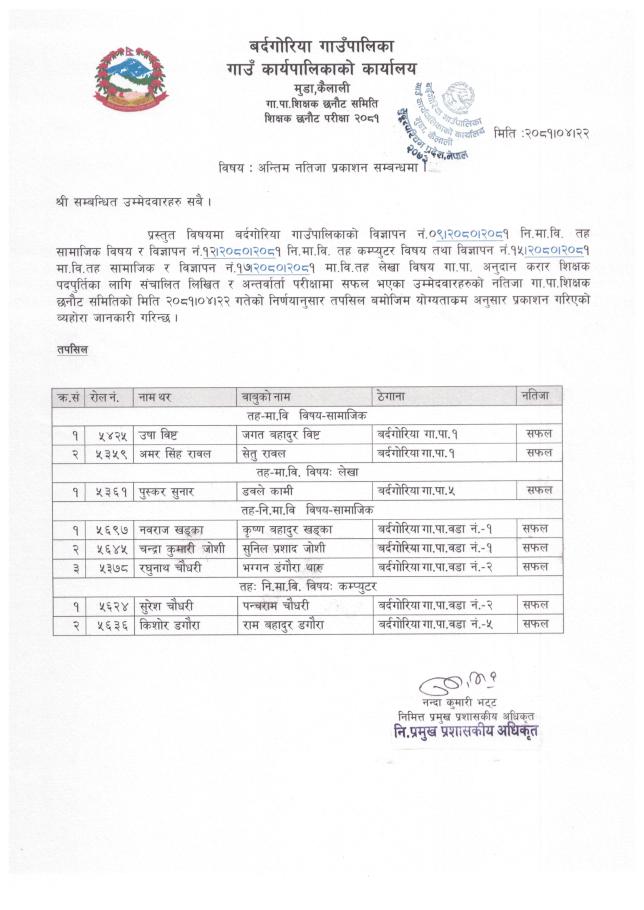 शिक्षक पदको लागि लिइएको परीक्षाको अन्तिम नतिजा प्रकाशन सम्बन्धी सूचना।