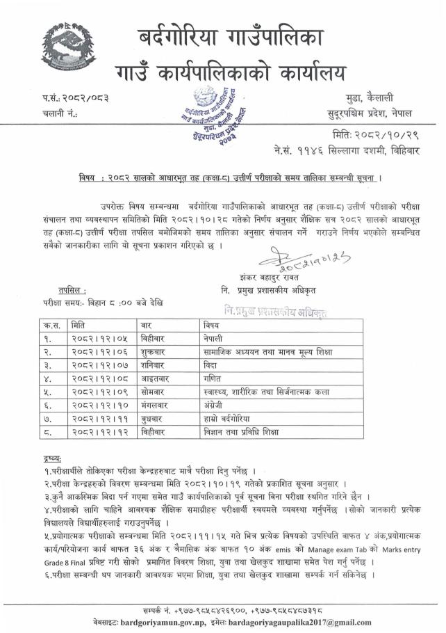 » २०८२ सालको आधारभूत तह (कक्षा-८) उत्तिर्ण परीक्षाको समय तालिका सम्बन्धी सूचना।