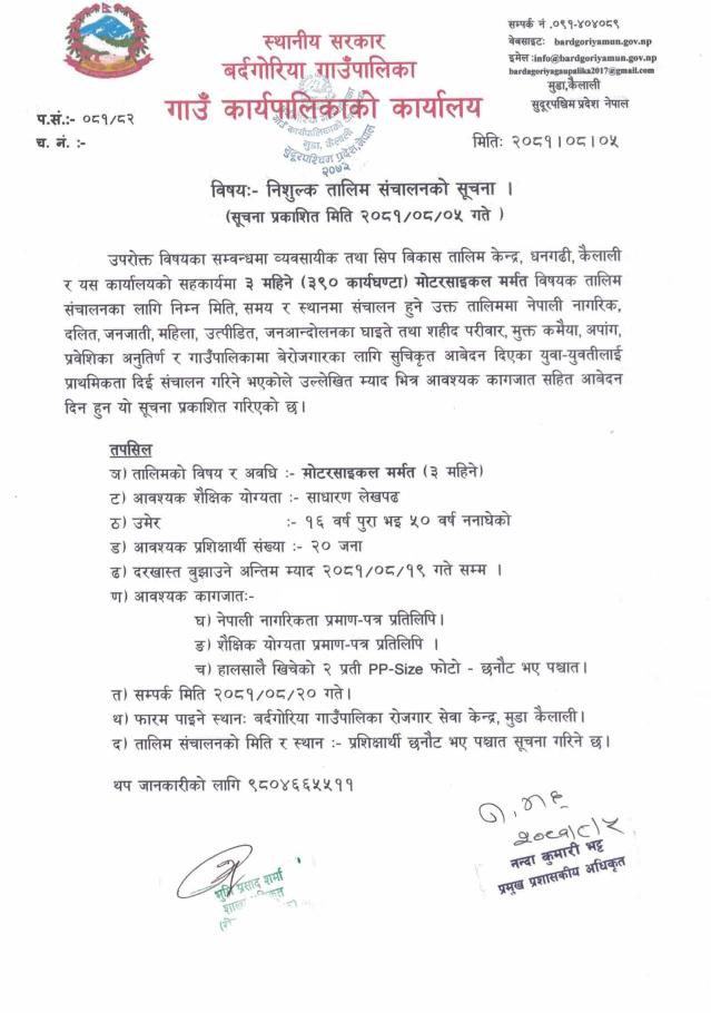 ३ महिने निःशुल्क मोटरसाइकल मर्मत तालिम सञ्चालन सम्बन्धी सूचना ।